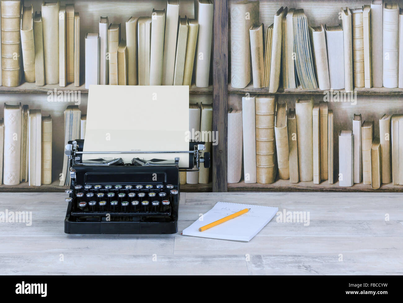 Vintage Typewriter Notepad And Pencil On Old Shabby Wood Effect