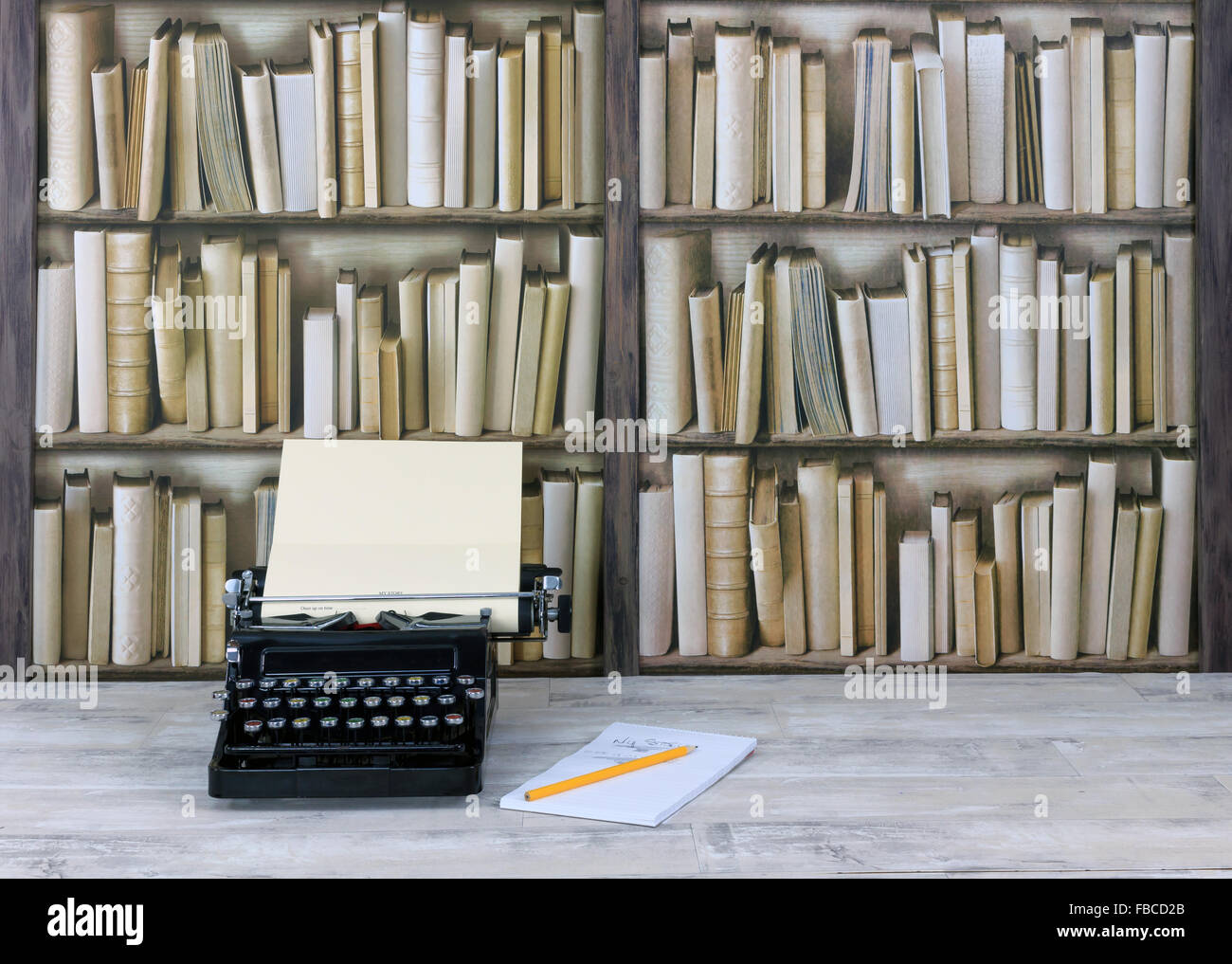Vintage Black Typewriter On An Old Desktop With An Old Bookcase