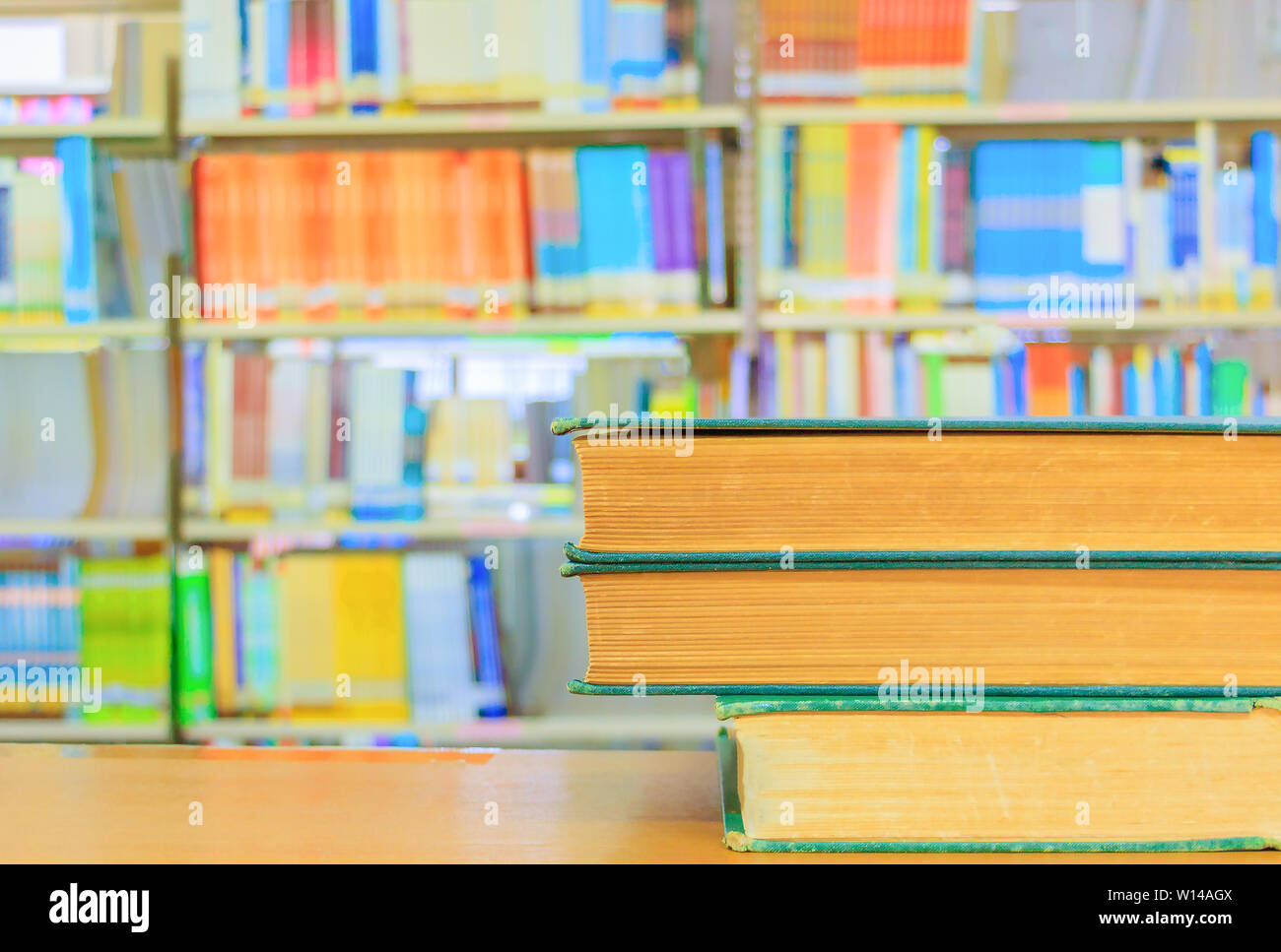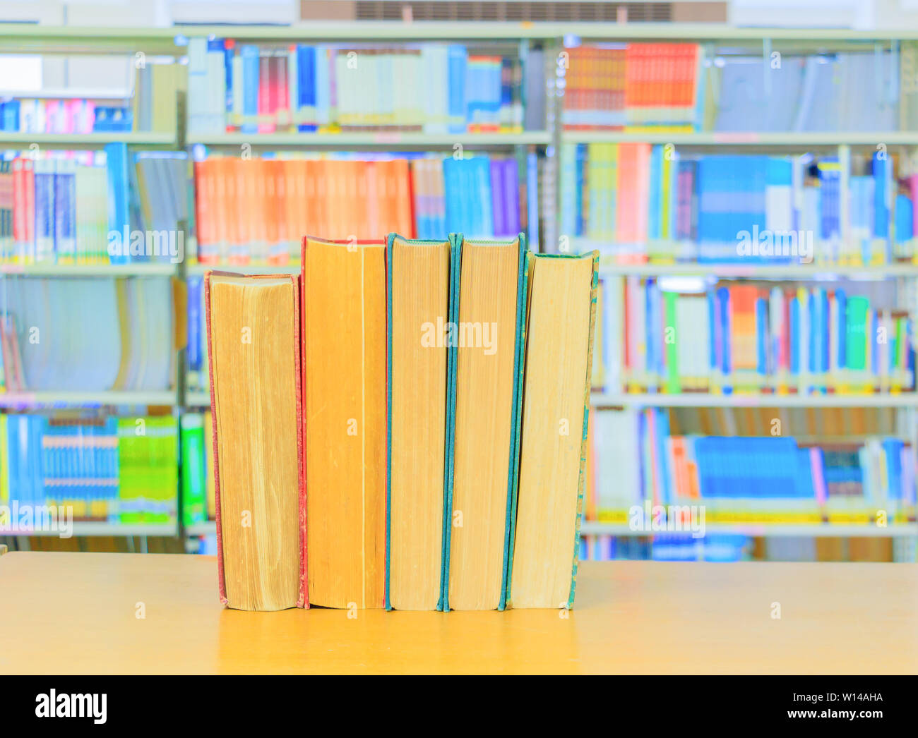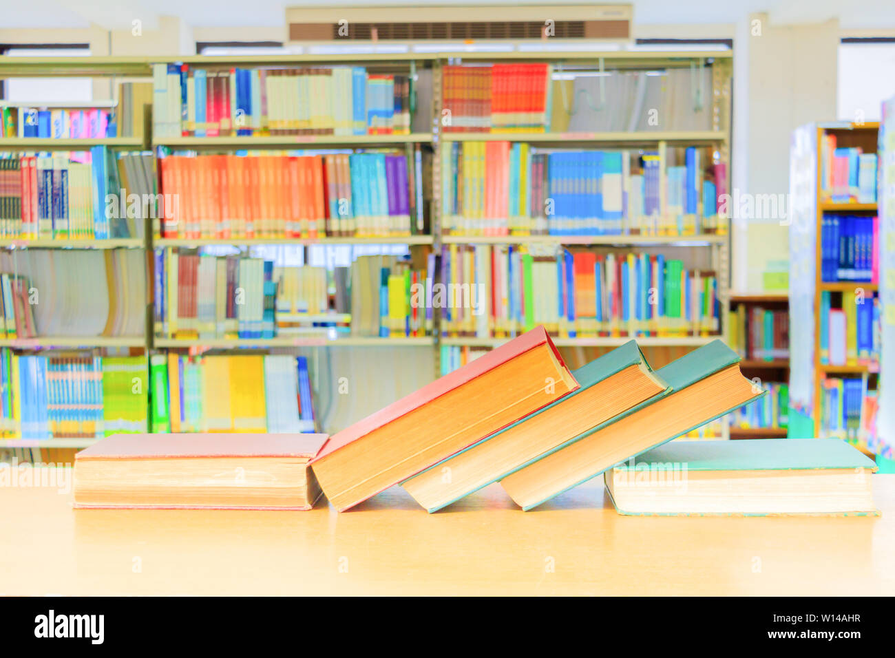 Old Book Red In School Library On Wooden Table Blurry Bookshelves