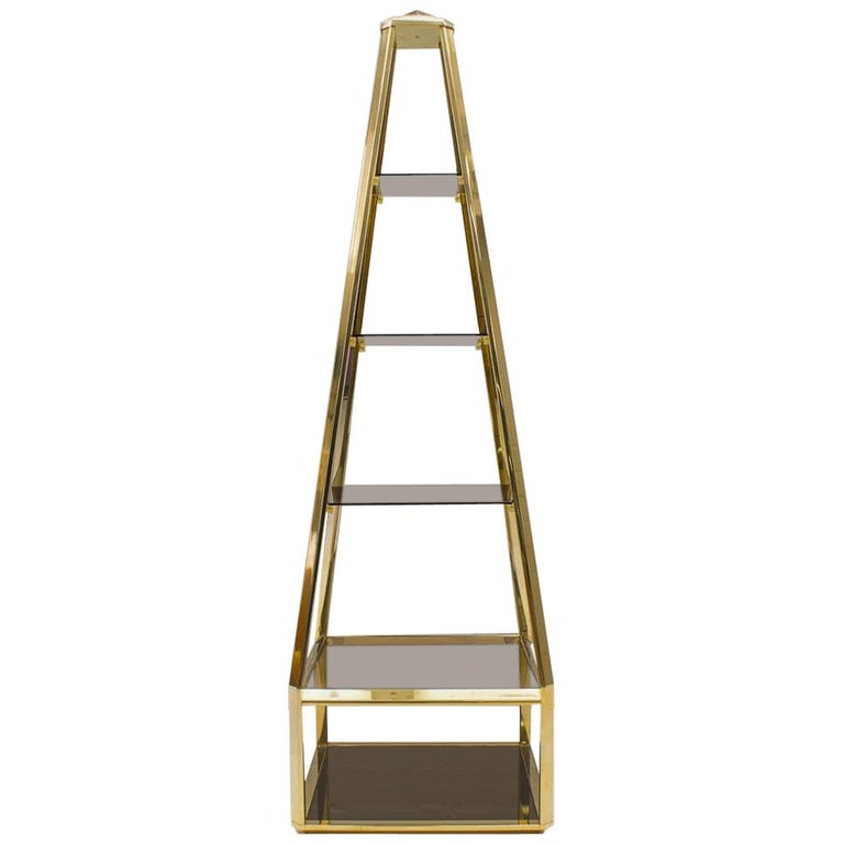 Hollywood Regency Pyramid Shelf In Gold And Smoked Glass France
