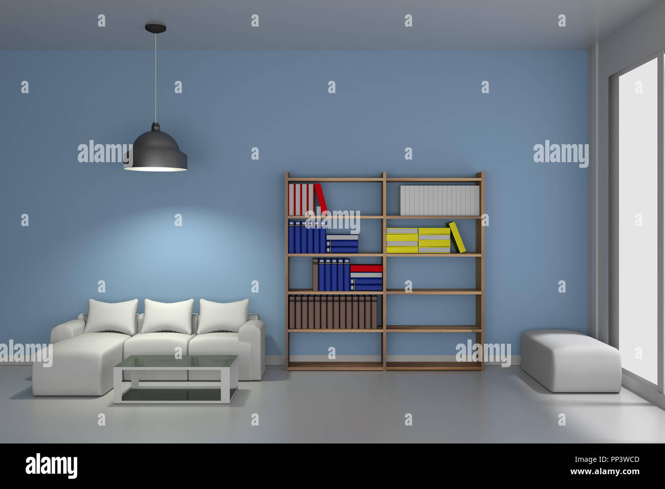 Living Room With Modern Bookcase 3d Rendering Stock Photo