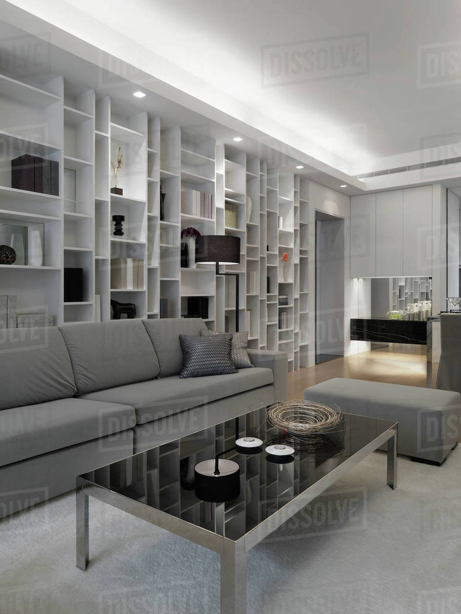 Modern Living Room With Wall Length Bookcase Stock Photo Dissolve